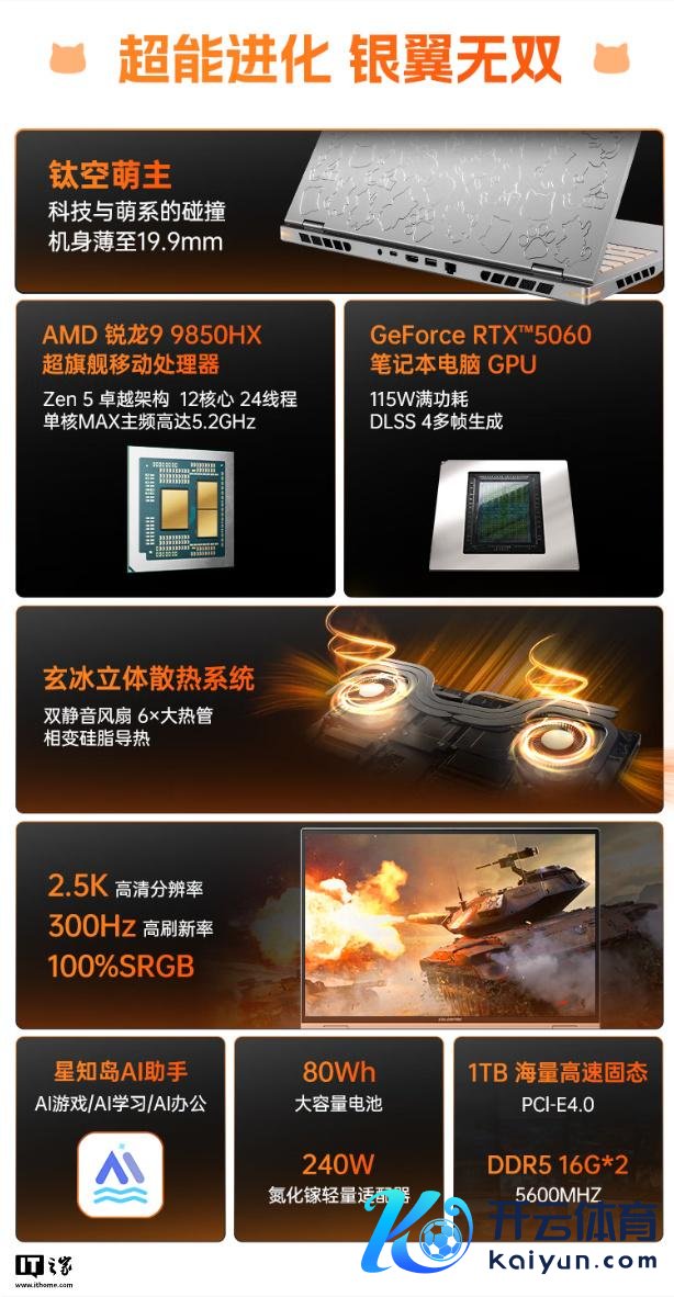 硬件方面,这款游戏本礼聘基于 Zen 5 架构的 AMD 锐龙 9 9850HX 科罚器,制程工艺为 4 纳米,搭配 12 核 24 线程,其主频最高可达 5.2GHz;可选 RTX 5060/5070 显卡,功耗均为 115W,均内置 8GB GDDR7 显存,援救 DLSS 4 多帧生成本领。